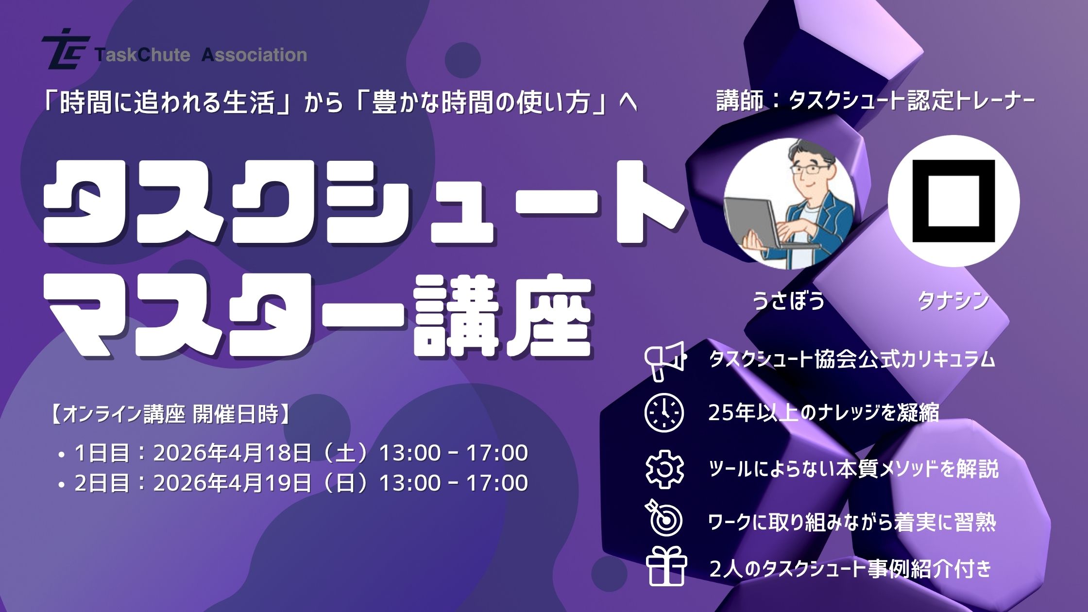 タスクシュート協会認定トレーナーである タナシン・うさぼうの2名が提供します。
